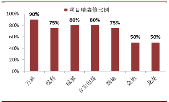 我國住宅精裝修發展歷史不足十年,尚處于起步階段。1999 年建設部發布《關于推進住宅產業現代化提高住宅質量的若干意見》,首次提出一次性裝修概念。2003 年以后,部分住宅開始出現精裝修,并呈現良好的增長態勢。 在住宅精裝修比例持續上升背景下, 近年來,大型地產開發商所開發項目的精裝修住宅比例亦持續上升。據統計, 2015 年度國內部分主要房地產開發商所開發項目的精裝修比例如下: