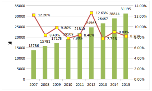 2010 年, 隨著全球經濟復蘇,我國國民經濟企穩回升; 2013 年,我國 GDP 總量達到 56.88 萬億,已成為僅次于美國的世界第二大經濟體。預計未來幾年內國內經濟增速仍將維持 7%左右的較高速增長態勢。隨著國民經濟持續向好,我國人均可支配收入快速攀升,構成了木門行業發展的基本因素。 2007 年-2015 年,我國城鎮居民人均可支配收入由 13,786 元/年提升至 31,195 元/年;根據規劃,到 2020 年我國居民人均收入有望比 2010年翻一番。人均可支配收入的快速提升為木門產品消費提供了源動力。