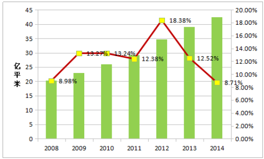 我國城市化率的提高從而帶動建筑裝飾行業的高速發展是推動木門行業發展的直接動力。 2014 年我國房屋建筑竣工面積達到 42.31 億平方米,比 2008 年增長了 108.73%。消費者的剛性需求在今后仍有巨大的釋放空間,我國建筑竣工、銷售面積及建筑裝飾行業仍將較快增長,根據中國建筑裝飾協會《中國建筑裝飾行業“十二五”發展規劃綱要》,到 2015 年,我國住宅裝飾市場將達到 1.2 萬億元的規模。得益于良好的行業發展態勢,木門需求市場將進一步釋放,木門行業將進一步擴張。