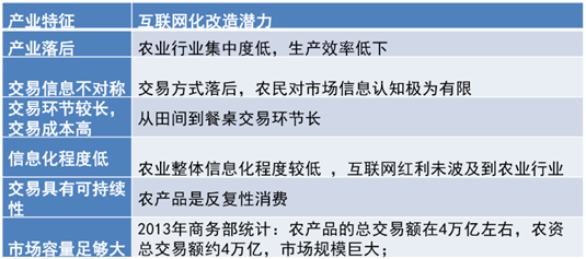 產業特征 互聯網化改造潛力 產業落后 農業行業集中度低,生產效率低下 交易信息不對稱 交易方式落后,農民對市場信息認知極為有限 交易環節較長, 交易成本高 從田間到餐桌交易環節長 信息化程度低 農業整體信息化程度較低 ,互聯網紅利未波及到農業行業 交易具有可持續性 ,農產品是反復性消費 市場容量足夠大