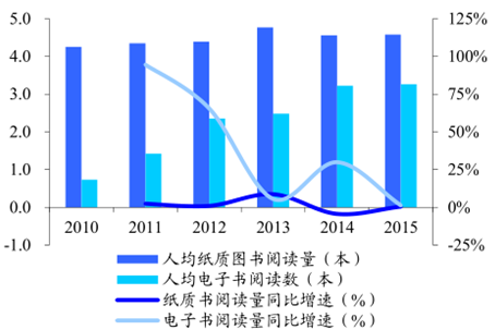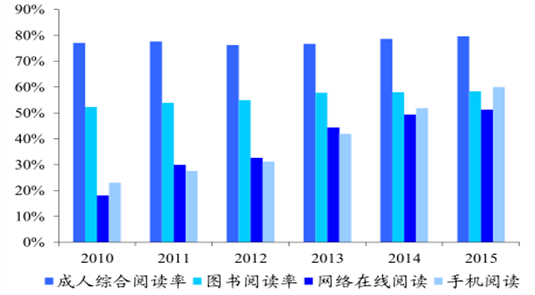 國家倡導全民閱讀,我國國民數字閱讀滲透率提升。自 2014 年始,倡導“全民閱讀”被連續三年寫入政府工作報告,2015 年首次提出“建設書香社會”。2016 年年初,國家新聞出版廣電總局下發《關于開展 2016 年全民閱讀工作的通知》,從十個方面對全民閱讀工作提出明確要求。在一系列政策引導和學習型社會氛圍下,我國國民閱讀率逐年提升,據調查顯示,2015 年我國成年國民綜合閱讀率為79.6%,較 2014 年上升 1.0 個百分點;受數字媒介迅猛發展的影響,PC、手機、電子閱讀器、Pad 等數字化閱讀方式的接觸率為 64.0%,較 2014年的 58.1%上升了 5.9 個百分點;另一方面,我國成人人均電子書閱讀數量增速遠高于紙質圖書,2015 年人均閱讀電子書 3.26 本,2010~2015年復合增速為 45.4%,遠高于紙質圖書同期 1.9%的復合增速。由于數字閱讀能夠較好的契合用戶生活習慣向線上遷徙和用戶時間碎片化的趨勢,同時其豐富的內容和便捷的閱讀方式極大的改變了人們的閱讀習慣,未來隨著互聯網尤其是移動互聯網覆蓋范圍和連接速度的進一步提升,數字閱讀在全民閱讀中的地位將更加重要。由于數字閱讀能夠較好的契合用戶生活習慣向線上遷徙和用戶時間碎片化的趨勢,同時其豐富的內容和便捷的閱讀方式極大的改變了人們的閱讀習慣,未來隨著互聯網尤其是移動互聯網覆蓋范圍和連接速度的進一步提升,數字閱讀在全民閱讀中的地位將更加重要。