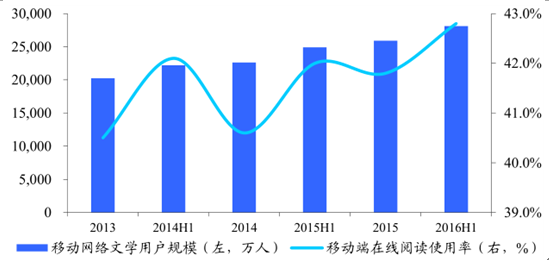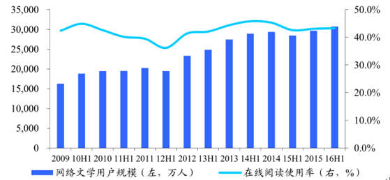 網絡文學用戶不斷增長,且以移動端用戶為主,在線閱讀使用率達到四成。網絡文學用戶不斷增長,且以移動端用戶為主,在線閱讀使用率達到四成。閱讀內容上,我國閱讀網絡文學的用戶在不斷增長,2009-2016 年上半年,網絡文學用戶自 1.6 億規模增長至 3.1 億,其中使用移動端的網絡文學用戶在 2016 年上半年達到 91.4%。另一方面,在線閱讀的用戶比例約四成,在線閱讀已經成為國民應用。