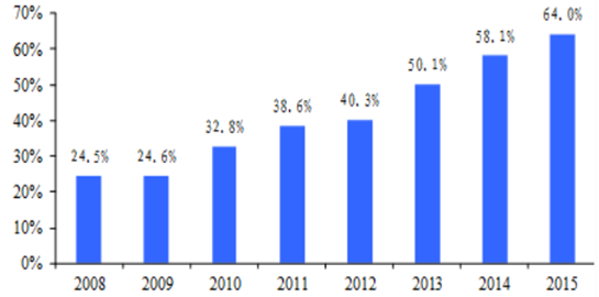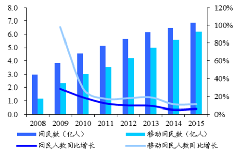 我國 PC 端和移動端用戶規模龐大且仍在上升,互聯網已經成為基礎設施。隨著網絡基礎設施建設水平的提高,移動互聯網的加快發展,網絡安全保障體系的更加完善和農村信息化使用深度的增強,我國網民規模和網絡使用率得到穩步提升。截止到2015年底,我國PC端網民數量已接近 7 億,移動網民 6.2 億。