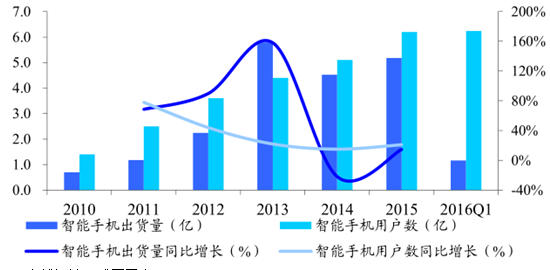 我國智能手機出貨量突破 5 億,智能手機用戶數穩定增長,移動互聯網已經普及。2013-2015 年我國智能手機每年出貨量保持 5 億左右規模,移動端硬件已經在我國普及。另一方面,我國智能手機用戶 2015 年突破 6 億,2013-2015 年保持每年 15%-25%的穩定增長率,使用移動互聯網的用戶規模巨大。