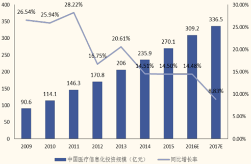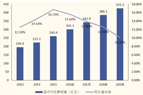 醫療 IT 行業花費與投資規模雙雙高速增長。數據表明,2014 年醫療衛生行業的 IT 投資規模達到 275.1 億元人民幣,比 2013 年增長 22.5%,繼續呈現穩步高速增長的態勢。2015 年醫衛行業信息化投資將保持增長態勢,達到 330.2 億元。據統計數據,2013 年中國醫療行業信息系統投資是 206.0 億元,預計到 2017 年醫療行業信息系統投資規模將達到 336.5 億元,增長速度高于中國 IT 市場的平均增速。