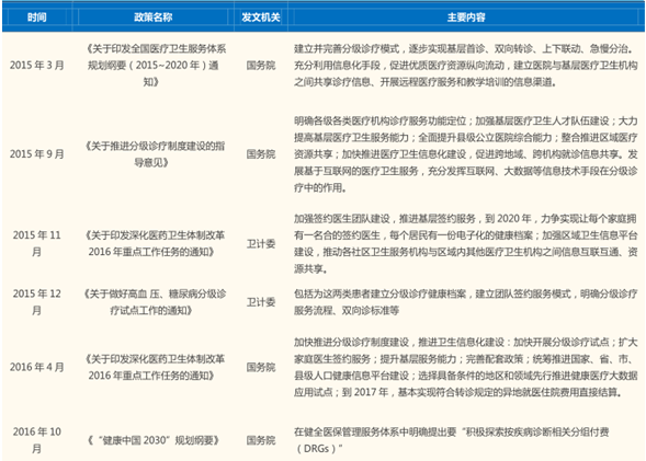 2016 年 4 月,在《關于印發深化醫藥衛生體制改革 2016 年重點工作任務的通知》 中,強調了加快推進分級診療制度建設,推進衛生信息化建設:加快開展分級診療試點;擴大家庭醫生簽約服務;提升基層服務能力;完善配套政策;統籌推進國家、省、市、縣級人口健康信息平臺建設;選擇具備條件的地區和領域先行推進健康醫療大數據應用試點;到 2017 年,基本實現符合轉診規定的異地就醫住院費用直接結算。