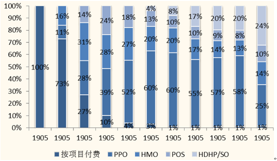 80 年代以前,私人醫保市場主要由營利性商業保險,以及非營利性醫保組織“藍十字計劃”“藍盾計劃”占據,付費模式和目前國內相同,醫保組織以項目計價對醫療機構付費。80 年 代以后,保健管理有健康維護組織、優惠服務提供者組織、服務點組織三種形式。這三種形式通過設置自付額的高低影響患者支付費用,有效控制了醫療消費增速,同時也降低了保費(由三大醫保籌資),從而調節患者在網絡與網絡外間的就醫流向,鼓勵患者在網絡內的社區就診。顯示出更強的競爭力,開始逐步分食按項目付費組織的市場。