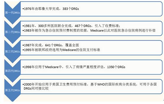 美國 DRGs 演進歷史:第一階段,第一代的 DRGs 是由耶魯大學在 1976年歷經 10 年的時間開發出來的,共制定了 383 個疾病組; 第二階段,第二代的 DRGs 由美國政府用了 6 年時間,根據全國抽樣的 40 萬份病例,并根據 ICD-9 疾病分類代碼將病例分為 23 個主診斷(MDC),467 個DRGs 組,在 1983 年的 Medicare 計劃中按照 DRGs 分組對醫院實行預付費制。 第三階段,第三代的 DRGs 由美國政府聯合國際衛生系統對 DRGs實施過程中出現的問題提出解決方案,增加到 641 個 DRGs 組,被聯邦政府選用為 Medicare 的住院支付標準; 第四階段,1998 年應用于 Medicare中,引入了病情嚴重程度評估,1350 個 DRGs; 第五階段,2000 年開始應用于美國衛生費用預付標準。