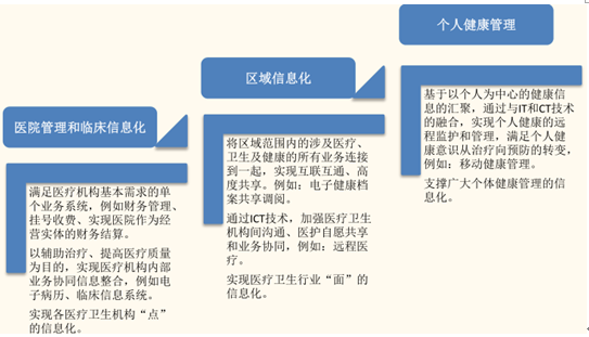 醫療信息化的發展可分為三個階段:醫院信息化、區域信息化、公共衛生信息化,目前醫院信息化已較為成熟,處于臨床信息管理系統信息化階段;各省區域信息化的項目都已處于開始建設或正在規劃階段。