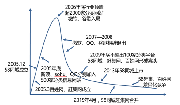 2000到3 ,分類信息行業的過山車。國內分類信息平臺的發展可謂跌宕起伏,第一批分類信息網站如百姓網、趕集網由一批愛好者成立于 2005年 3 月,2005 年底業內企業已經擴展到了 500 家,包括新浪、搜狐、QQ以及現在的行業龍頭 58 同城;2006 年國內分類網站達到巔峰,出現了超過 2000 家分類平臺,并吸引了微軟、谷歌等國際巨頭的加入。但好景不長,由于缺乏穩定的盈利模式和高額的市場拓展費用,2007 年開始出現了大量的企業退出,到 2009 年,只剩下不超過 100 家分類平臺,真正運營的不超過 20 家,也形成了以 58 同城、趕集網和百姓網三寡頭競爭的行業格局,并延續至今。