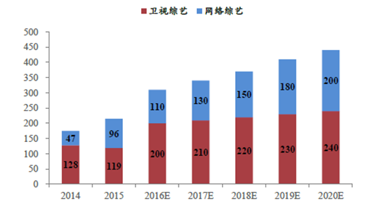 核心提示:廣告市場方面,2018年我國廣告市場可達5500億,其中我們估算藝人代言成本約為100億(內容成本占10%,藝人占內容成本的20%),去掉頭部藝人約為50億元(1000萬/人每條,一年500條),偶像藝人廣告代言市場可達50億。綜藝市場方面廣告市場方面,2018年我國廣告市場可達5500億,其中我們估算藝人代言成本約為100億(內容成本占10%,藝人占內容成本的20%),去掉頭部藝人約為50億元(1000萬/人每條,一年500條),偶像藝人廣告代言市場可達50億。綜藝市場方面,預計2016年我國衛視綜藝超過200部,網絡自制綜藝超過110部,到2020年我國綜藝數量可達440部,每部綜藝制作成本在1千萬到1個億不等,假設平均每部制作成本為5000萬,其中50%成本為藝人成本,藝人成本約為110億,剔除頭部藝人(占50%左右)后,偶像藝人綜藝市場規模約為55億。