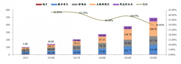 綜上,我們估算2015年偶像音樂市場約為100.28億,到2020年可達(dá)494.59億元,CAGR約為31%。