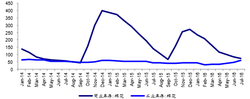 2016 年棉花此前上漲的最主要邏輯在于市場出現階段性的供求缺口,市場庫存與國 儲庫存之間存在供需錯配。短期市場供求缺口由國儲填平,當國儲庫存的壓力釋放完畢 將迎來長期上漲的波段行情。