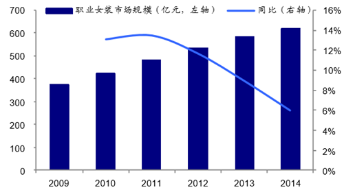 職業(yè)裝按照功能主要分為商業(yè)活動中常用的商務(wù)職業(yè)裝、體現(xiàn)行業(yè)特點(diǎn)和企業(yè)形象 的職業(yè)制服以及具有安全性、功能性的職業(yè)工裝。隨著行業(yè)特點(diǎn)的區(qū)分度加強(qiáng),企業(yè)對 文化和形象的投入力度加大,以人為本的觀念深入人心,各行各業(yè)服飾代表性、安全性、 舒適性、功能性需求增加,催化職業(yè)裝市場。職業(yè)女裝市場規(guī)模由 2009 年的 375 億元 增長到 2014 年的 620 億元,增速達(dá) 65.3%。隨著國家的現(xiàn)代化水平不斷提升以及人們 的生活節(jié)奏加快,職業(yè)裝行業(yè)也在持續(xù)增長,且職業(yè)裝市場尚未形成知名品牌壟斷局面, 具有品牌培育機(jī)會,巨大的市場容量和廣闊的前景使得職業(yè)裝逐漸成為服裝行業(yè)又一片 新藍(lán)海。