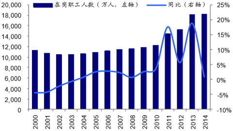 2000 年至今,我國在崗職工人數(shù)始終維持在 1 億人以上,2004 年,在崗職工人數(shù) 為 1.06 億,同比增長 0.8%,為 1996 年以來首次正增長。2004 年至 2014 年,在崗職 工人數(shù)始終處于增長狀態(tài),其中 2013 年達(dá)到 1.81 億人,同比增長 18.85%,2014 年為 1.83 億,增速放緩,為 0.94%。龐大的在崗職工群體,為職業(yè)裝市場發(fā)展提供了需求基 礎(chǔ)。