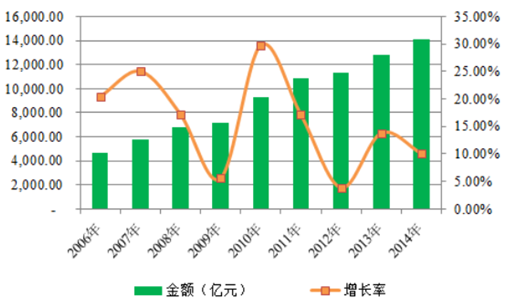 20 世紀 90 年代以來,全球家電產業逐漸向中國、印度等發展中國家轉移,憑借勞動力成本低廉等比較優勢,我國家電行業的發展日新月異。 2006 年,我國家用電器制造業主營業務收入為 4,621.00 億元,而 2014 年度,家用電器制造業主營業務收入達到 14,139.10 億元,年均復合增長率達到 15%。根據株式會社富士經濟的預測, 2016 年中國家電生產量占世界家電產量的比重將達到 84%左右。