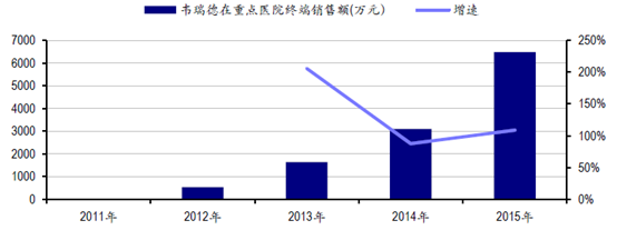 2011-2015年替諾福韋酯(韋瑞德)在重點醫院終端銷售額及增速