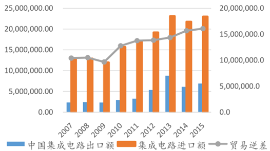 國內需求充足,進口替代空間巨大。中國集成電路市場規模雖然大,但不可回避的問題是其自給率偏低。據統計,2015 年中國集成電路進口金額比去年同期增長 6%,達到 2307 億美元,而出口金額為僅為 693.1 億美元,進出口逆差仍然有 1613.9億美元,這表明國內有極大的進口替代空間。