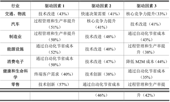 對(duì)全球 M2M 技術(shù)的應(yīng)用現(xiàn)狀及未來(lái)趨勢(shì)進(jìn)行了調(diào)研,根據(jù)調(diào)研結(jié)果,各行業(yè)對(duì) M2M 技術(shù)最看重的三個(gè)驅(qū)動(dòng)因素以及各驅(qū)動(dòng)因素所占比重如下:
