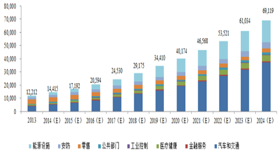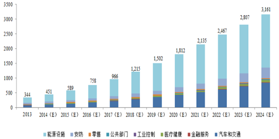 按照行業(yè)劃分,2013 年至 2024 年全球 M2M 設(shè)備連接預(yù)測(cè)(數(shù)量:百萬(wàn))