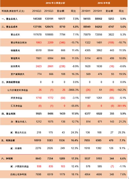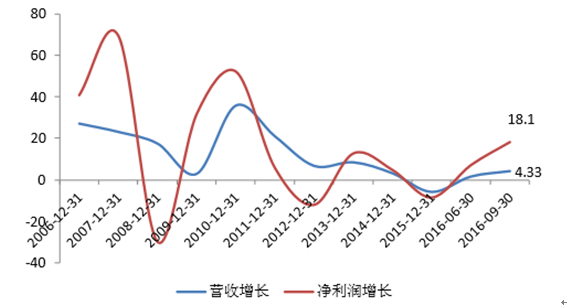 2016 年前三季度,非金融石油石化行業分別實現營收和凈利潤 14.54 萬億和 7698 億元,分別同比增長 7.5%和 18.1%,利