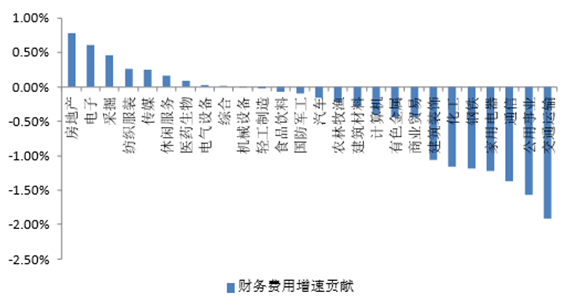 除匯率的影響外,公用事業、通信、鋼鐵、化工、建筑裝飾等行業本身負債率較高,財務費用下行則主要受益于利率下降。