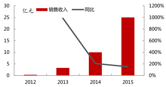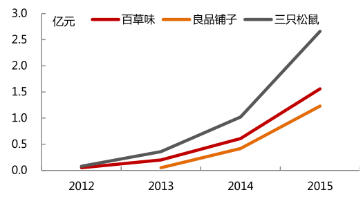 三只松鼠自成立以來,銷售規模呈現出幾何級數式的增長。三只松鼠是中國第一家定位于純互聯網食品品牌的企業,于 2012 年 6 月 19 日上線,現已成為堅果類 B2C 電商企業中的領航者。自成立以來年銷售規模呈現出幾何級數式的增長,在成立當年即實現銷售收入3000 余萬元;2013 年銷售收入達 3.26 億元,同比增長將近 10 倍;2014 年銷售收入突破10 億元,同比增長 2 倍左右;2015 年銷售收入 25 億元,同比增長 1.5 倍。