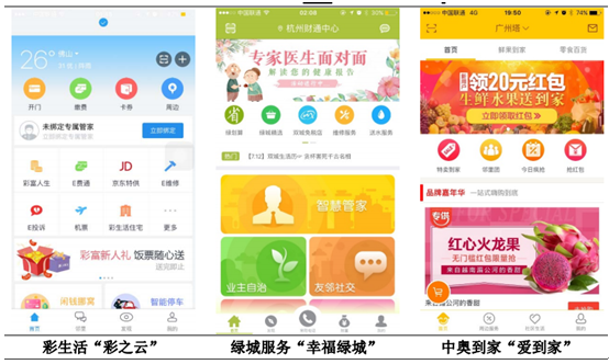 在社區 O2O的市場機遇下, 物業服務企業紛紛建設或投資社區 O2O方面的服務平臺,為業主和住戶提供更立體化的服務,如彩生活推出“彩之云”,綠城服務推出“幸福綠城”,中奧到家推出“愛到家”,豐富自身為業主和住戶提供的業務類型。