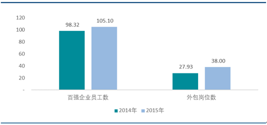 2015 年,行業百強企業中有 169 家將部分基礎業務交由專業外包服務公司管理,比 2014 年的 159 家上升 6.29%。對比企業員工與外包人員數量來看,行業百強企業在2015年外包員工數為38 萬人,占一線員工3的 26.55%,同比增加了 10.07 萬人,增幅達到 36.05%。