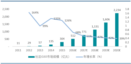 目前社區商業在我國還處于發展階段,占商業總體規模比例有限。在未來商業服務將逐步向終端消費者靠攏的趨勢下, 社區商業在整體商業發展中的占比將繼續提升,帶動社區 O2O 市場規模擴張。社區O2O是指在社區場景發生并完成消費的 O2O市場。此處社區場景指以社區及以之為核心周邊距離 3-5 公里范圍內,滿足社區居住人群生活需求的商家構成的場景。 社區 O2O提供的服務以滿足居住人群生活需求為主,消費形式包括到店服務及上門服務,行業涵蓋餐飲、社區零售、洗衣服務、家政清潔、 美容美發、 以及社區觀影及沐浴等休閑服務行業。 2015 年我國社區 O2O 市場規模達 304 億元,并將在未來保持增長,到 2020 年將達到 2,234 億元,年復合增長率達 49%。
