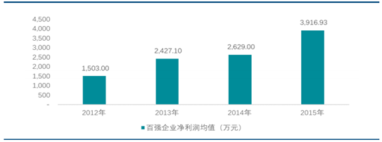 在物業管理行業進入跨界融合、創新發展的大背景下,物業服務企業通過提高績效,發展創新業務,明顯提升了經營績效。行業百強企業在 2015 年實現的營業收入均值為 5.41 億元,同比增長達27.24%;在2015 年實現的凈利潤均值為3,916.93 萬元,同比增長達48.99%,凈利潤均值在2012 年至 2015年的復合增長率達到 37.61%。
