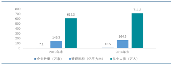 根據中國物業管理協會發布的《2015 全國物業管理行業發展報告》,截止2014 年底,全國物業管理面積約為 164.5 億平方米,較 2012 年底的 145.3 億平方米增長了約 13.5%,行業物業管理規模持續擴大。同時,物業服務企業數量和行業從業人員也快速增長。截止2014 年底,全國物業服務企業約 10.5萬家,從業人員約 711.2 萬人,分別比 2012 年底的數量增長了約 48%和16.2%。