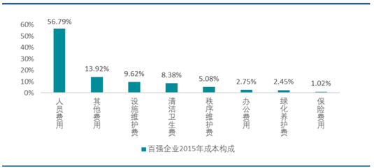 在物業服務企業成本構成中,人工成本及勞動密集的外包業務成本為最主要部分。行業百強企業2015 年人工成本、 清潔衛生費、 秩序維護費、 綠化養護費分別占成本比例為 56.79%、 8.38%、5.08%、2.45%,合計占比達 72.70%。