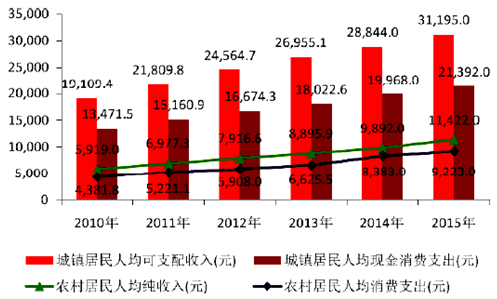 2010-2015 年我國城鄉(xiāng)居民收入及消費(fèi)情況