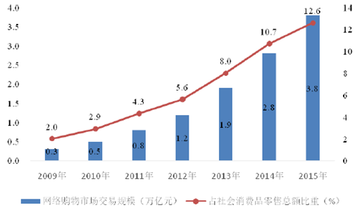 2009-2015 年我國網(wǎng)絡(luò)購物市場交易規(guī)模及占社會消費(fèi)品零售總額比重