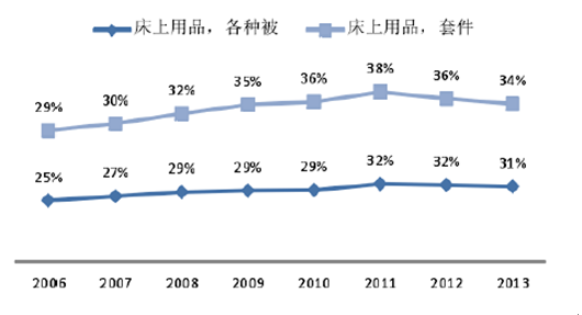 我們認為家紡目前所在周期最鮮明的特點是大規模、低集中、共同成長。中國每年6000 億家紡消費市場,近3000 億的床上用品消費額,中國軟裝飾的年消費能力達2000 億至3000 億元,市場規模及發展空間非常大。但在所謂的共同成長特性下,指競爭對手之間的影響不大,整個行業的馬太效應還不明顯,大部分消費者對家紡產品還沒有形成品牌忠誠度。而共同成長這一特性隨著家紡家居一體化時代的到來會逐漸消失。