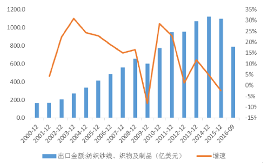 2000-2016年紡織紗線、織物及制品出口情況