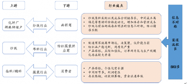 目前行業的痛點在于從上游制造端來說,紗線雖然標準度相對較高,但棉花原材料的波動會增加庫存和管理成本,同樣紗線與前后端存在明顯的信息不對稱,其中天然纖維主要是棉、麻、毛、絲,它們從原產地的產出到采購商的收購之間存在較長的分銷環節。而面料端與服裝端的產品大多是非標的,存在訂單碎片化與生產規;拿堋R虼诵袠I需要完整的供應鏈平臺打通上下游的信息流、物流以及資金流,來縮短交易次數和物流次數,打造柔性供應鏈提高整個行業的流通效率。