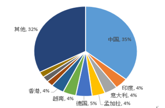 2015年世界紡織服裝出口主要國家市場占比