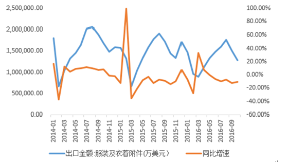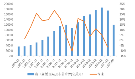 2000-2016年服裝及衣著附件出口情況