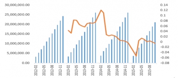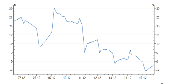 2014-2016年服裝類出口金額當月同比