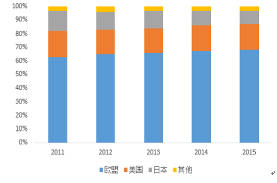2011-2015年我國紡織服裝出口主要目的國份額