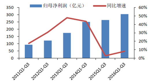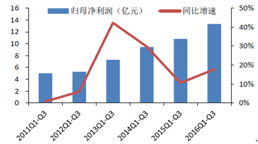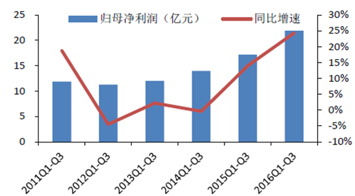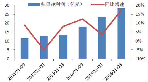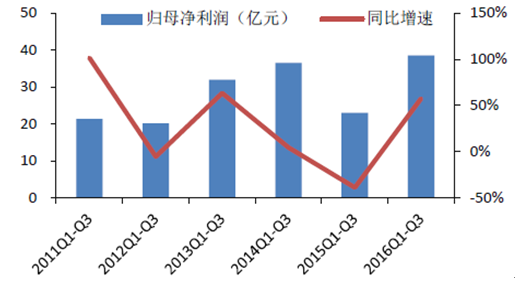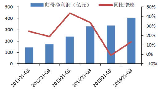 2016Q1-Q3零部件行業(yè)歸母凈利潤同比增長24.33%