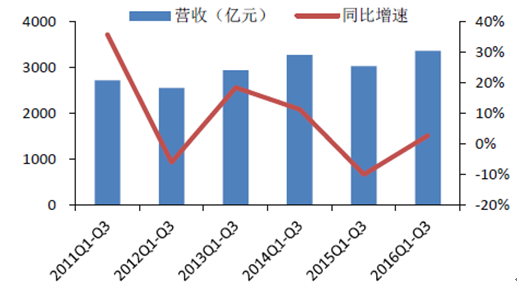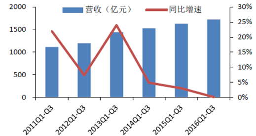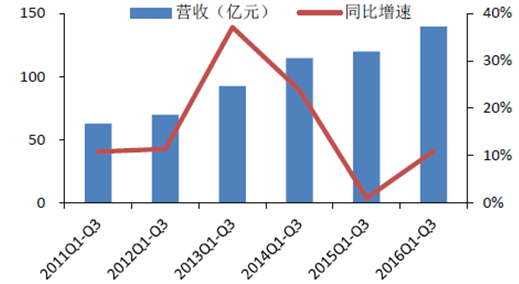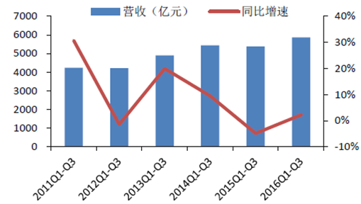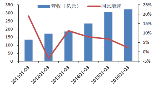 2016Q1-Q3家電行業(yè)整體營收同比增長2.20%