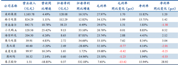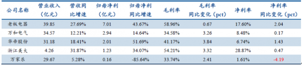 從個(gè)股來看,民生家電行業(yè)51家樣本企業(yè)中,有41家企業(yè)營收同比正增長,占比80.39%,其中,有23家企業(yè)營收增速超過10%;39家企業(yè)歸母凈利潤同比正增長,占比76.47%,有34家企業(yè)歸母凈利潤同比增速超過10%。