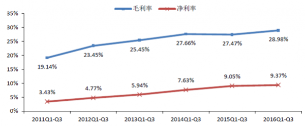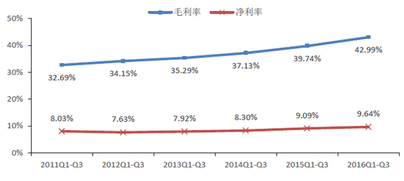 受益于渠道與產(chǎn)品結(jié)構(gòu)升級,廚電子行業(yè)毛利率與凈利率均明顯提升:2016年前三季度毛利率同比增長3.25pct至42.99%,凈利率上升0.55pct至9.64%。