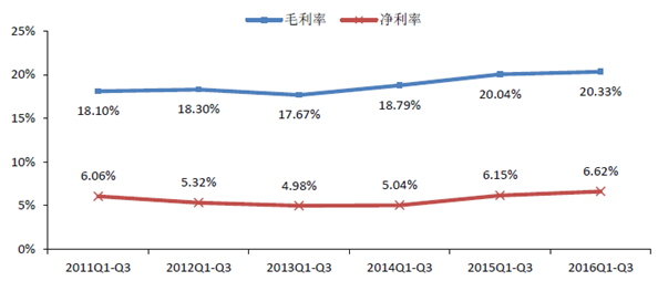 家電零部件企業(yè)經(jīng)營家電企業(yè)拉動作用明顯,2016年前三季度家電零部件企業(yè)毛利率同比增長0.29pct至20.33%,凈利率上升0.47pct至6.62%。