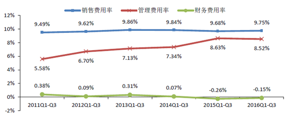 2016Q1-Q3銷售費(fèi)用率基本持平,管理費(fèi)用率同比下降0.11pct