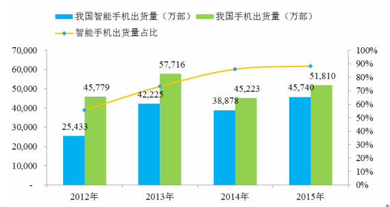 我國手機、智能手機行業近四年來也發展迅速, 2012 年至 2015 年,我國智能手機出貨量分別達到 25,433 萬部、 42,225 萬部、 38,878 萬部及 45,740 萬部,占全球智能手機出貨量的比重分別為 35.08%、 42.06%、 29.88%及 31.94%; 2012年至 2015 年,我國手機出貨量分別達到了 45,779 萬部、 57,716 萬部、 45,223 萬部及 51,810 萬部,占全球手機出貨量的比重分別為 26.34%、 31.68%、 24.07%及26.30%。 2012 年至 2015 年,我國智能手機出貨量占我國手機出貨量的比例分別為 55.56%、 73.16%、 85.97%及 88.28%。由于智能手機對精密金屬結構件的需求高于普通手機,因此,我國手機、智能手機出貨量占全球出貨量的比例增加以及我國智能手機出貨量占手機出貨量比例的增加都有利于刺激對我國生產的手機精密金屬結構件的需求。我國手機、智能手機出貨量如下圖所示: