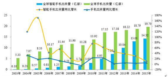 二十一世紀以來,以手機尤其是智能手機為代表的通訊終端迅猛發展,手機全球出貨量由 2003 年的 5.33 億部增長至 2015 年的 19.70 億部, 年均復合增率達到了 11.50%。近年來,智能手機更是由于其獨立的操作系統、獨立的運行空間、 大屏幕的外觀設計等各種現代配置及設計理念滿足了消費者自行安裝第三方軟件等個性化需求而迅速崛起, 2003 年智能手機全球出貨量僅為 957.12 萬部,2007 年該數字便達到了 1.25 億部,與 2003 年相比增長了十余倍。 2013 年,全球智能手機出貨量首次突破十億部,達到了 10.04 億部,相比 2003 年增長了百余倍,比 2007 年全球智能手機出貨量的八倍還多。 2015 年全球智能手機出貨量達到 14.32 億部,同比增長 10.07%; 2010 年至 2015 年,全球智能手機出貨量年均復合增長率高達 36.25%。智能手機產業正在經歷著最黃金的發展時期,智能手機在整個手機通訊設備中的比例由 2003 年的 1.79%已增加至 2015 年的72.69%, 而隨著人們對智能手機更新換代要求的提高和擁有多部智能手機需求的激發,智能手機產業未來幾年仍將保持較快速度的增長,且智能手機將基本完全替代傳統手機的地位。全球手機、智能手機出貨量及同比增長率如下圖所示: